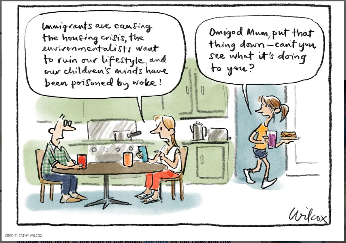The Cathy Wilcox cartoon in The Age 10th December 2025 (Melbourne) says it all about an aspect of today’s society.